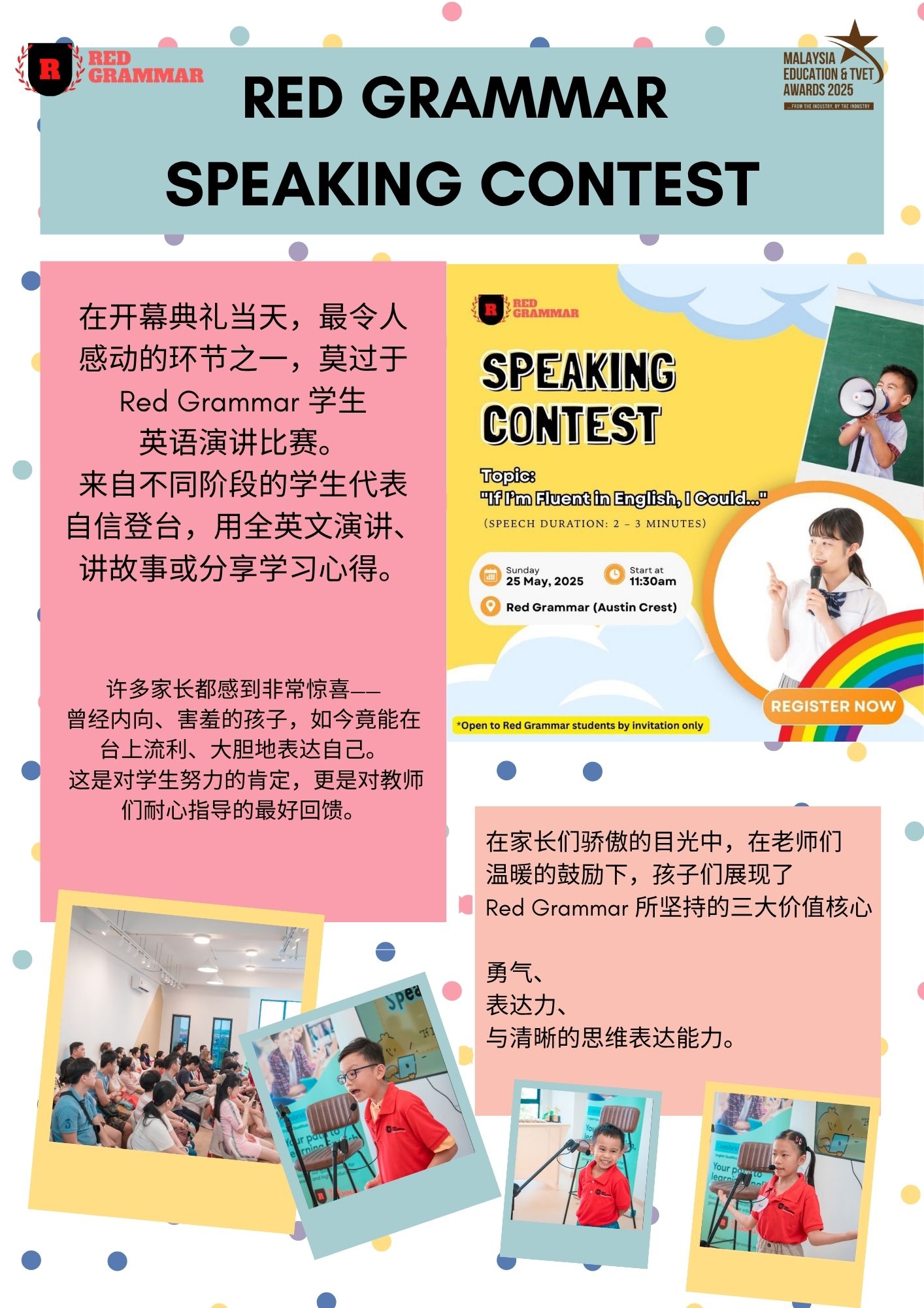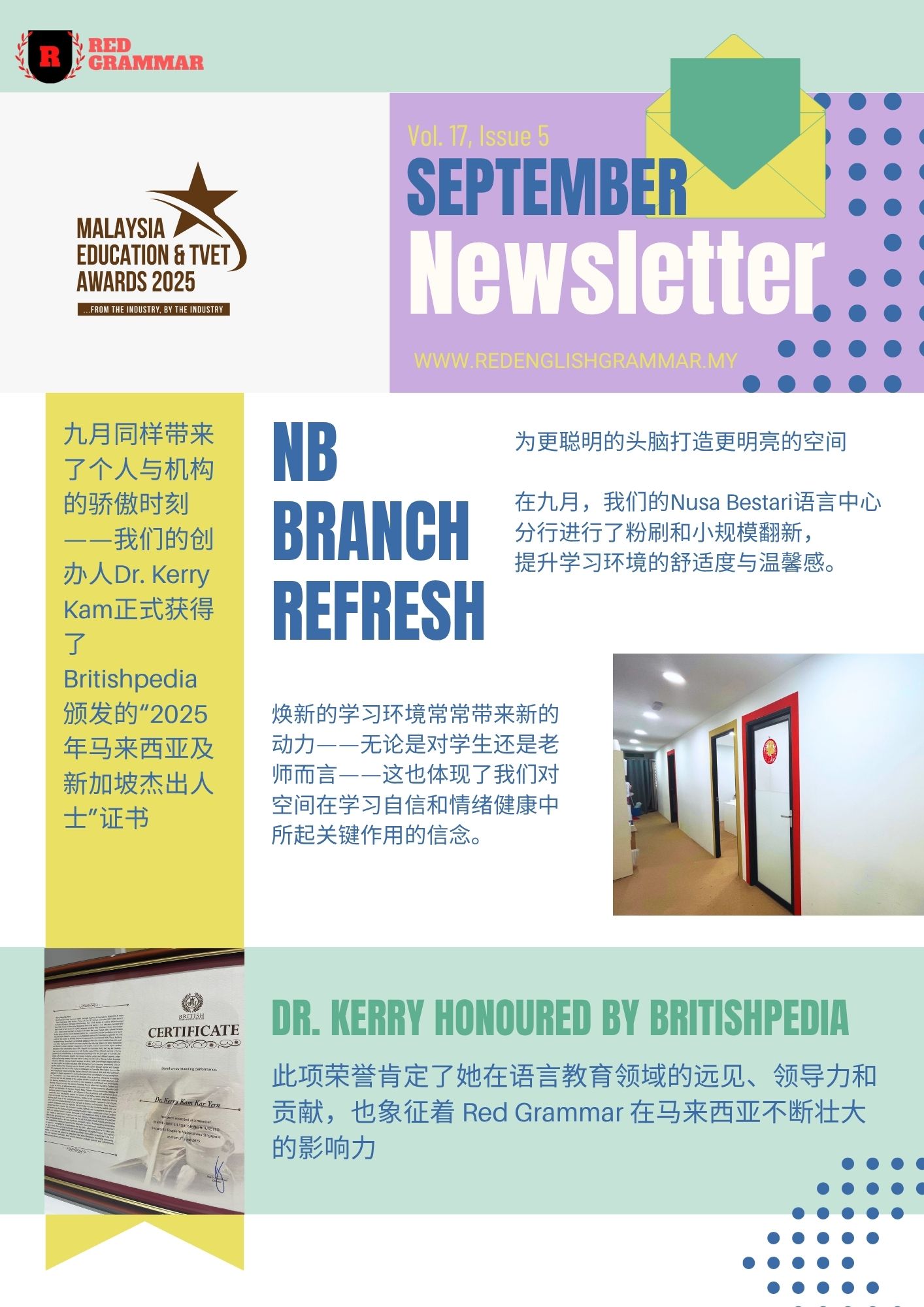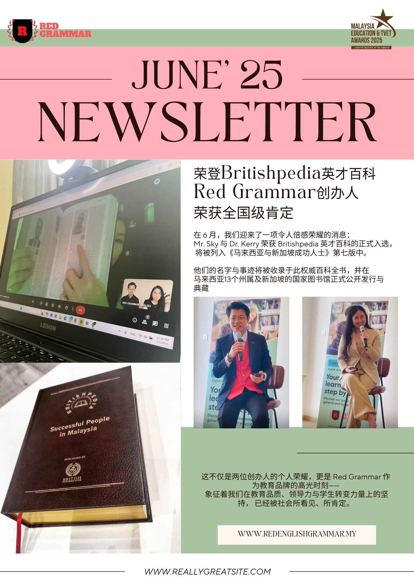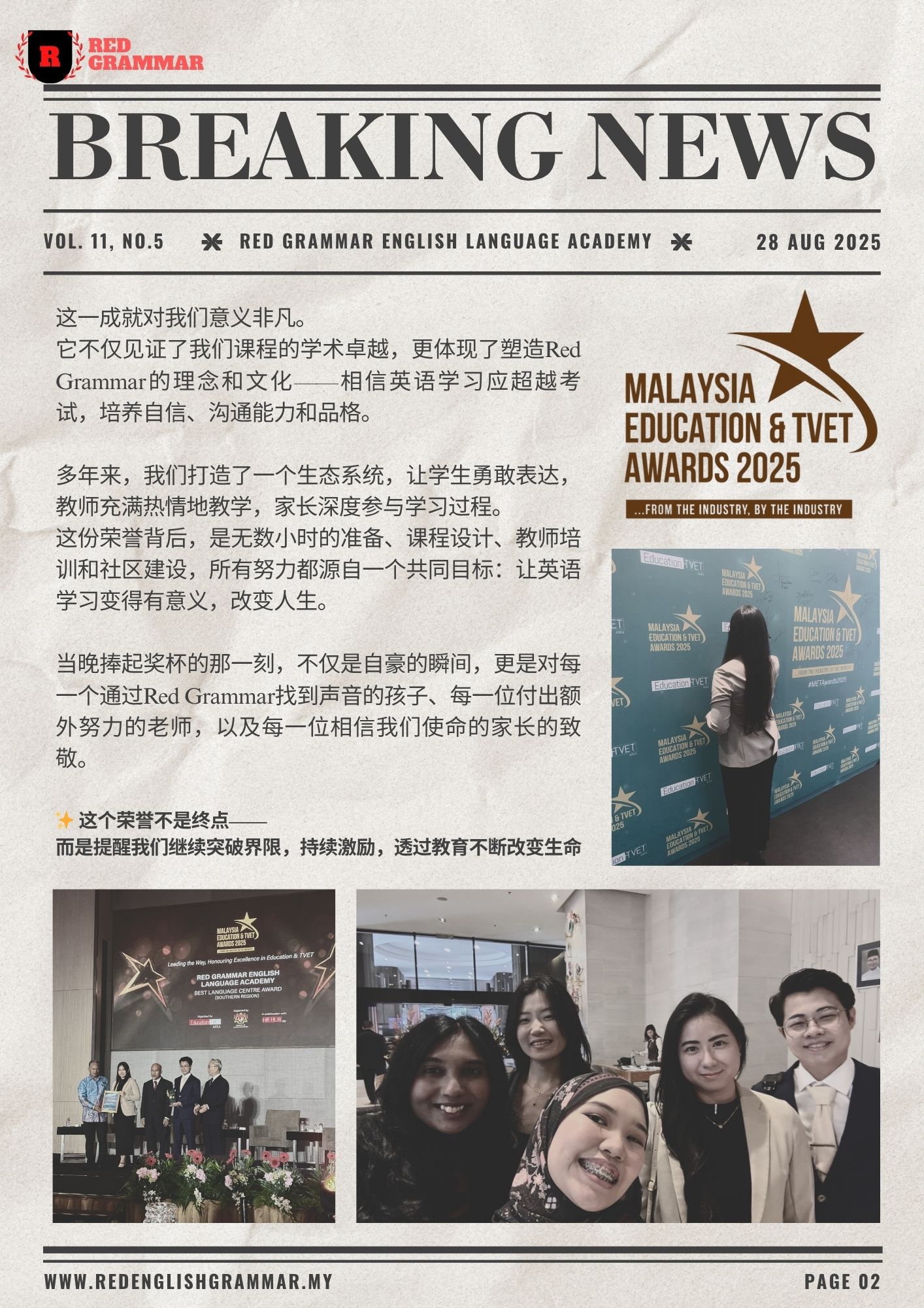 我们欣然宣布 —— Red Grammar 英语语言学院 荣获 2025 年 META(Malaysia Education and TVET Awards) 颁发的 「南马区最佳语言中心奖(Best Language Centre – Southern Region)」!